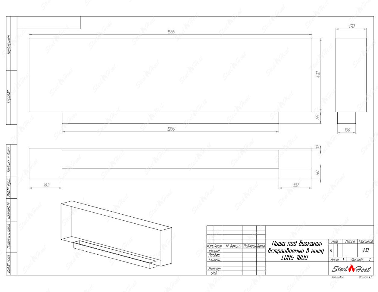 Встраиваемый Биокамин SteelHeat LONG-H 1800 предназначен для встраивания в глухие ниши из гипсокартона, кирпича, пеноблоков, бетона.